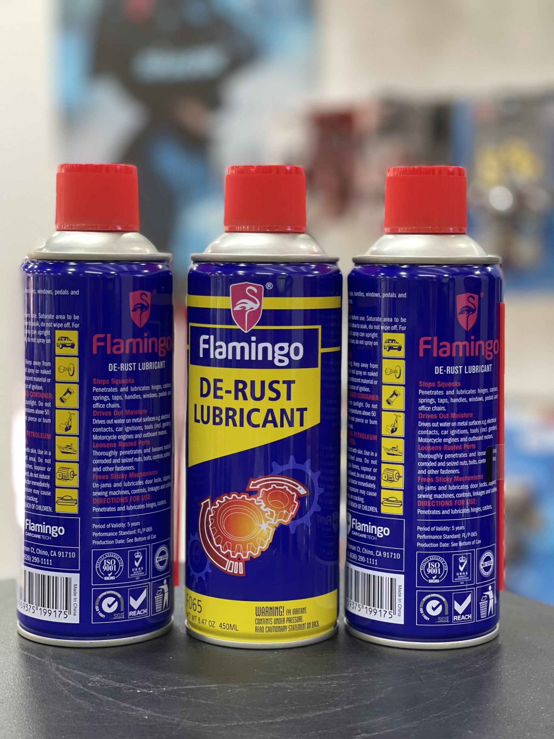 Flamingo De-Rust Lubricant is a multi-purpose maintenance spray designed to protect, clean, and lubricate metal surfaces. It penetrates deep into rusted parts, loosens stuck mechanisms, and forms a long-lasting protective film to prevent future corrosion. Ideal for home, automotive, industrial, and marine applications.